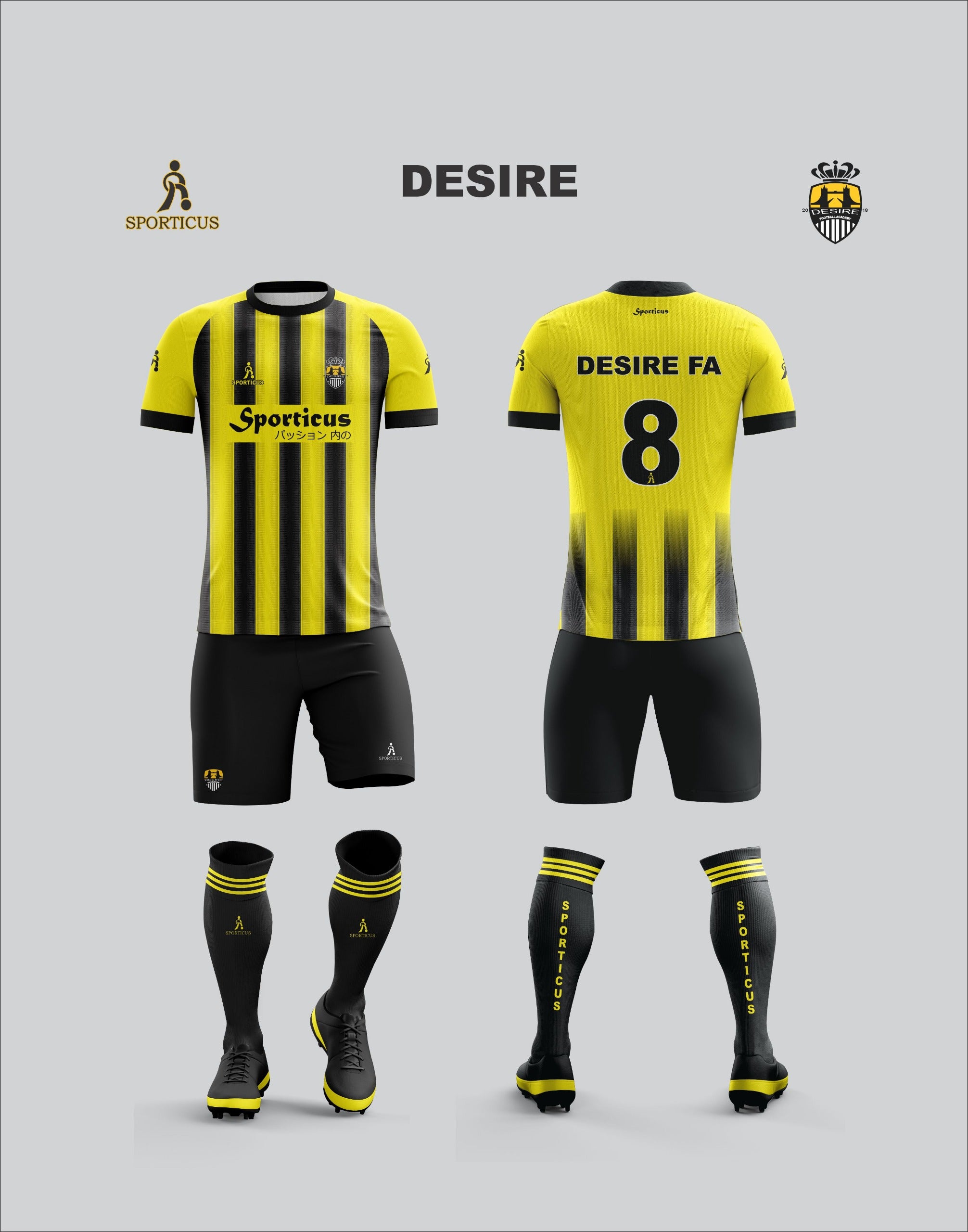 To Celebrate success of Desire Football Academy over recent years. Sporticus has done an amazing new fully functional kit with multiple vent panels in a very special fabric called Premium Dry Fit.